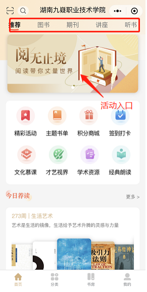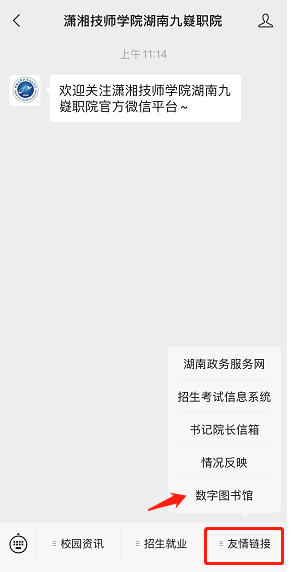 查阅入口:关注学校微信公众号,进入【潇湘技师学院湖南九嶷职院】--点击【友情链接】--点击【数字图书馆】就可以进入平台界面。