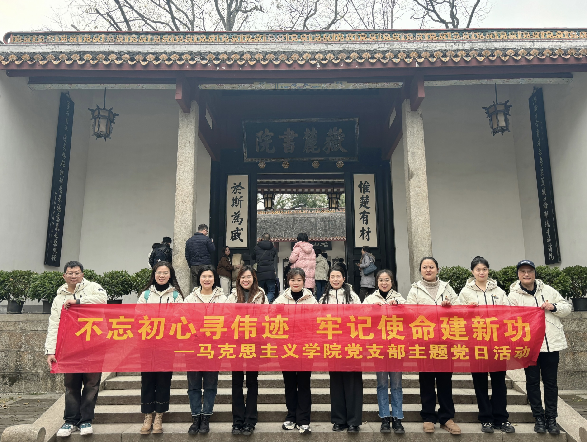 为深入学习贯彻落实习近平总书记在湖南考察时的重要指示精神,切实增强党员干部理想信念和纪律意识,激发全体党员同志的使命担当,结合党建工作实际需求,马克思主义学院党支部于2025年1月2日赴长沙岳麓书院、岳麓山开展“不忘初心寻伟迹 牢记使命建新功”主题党日活动,正式党员共计10人参加活动。