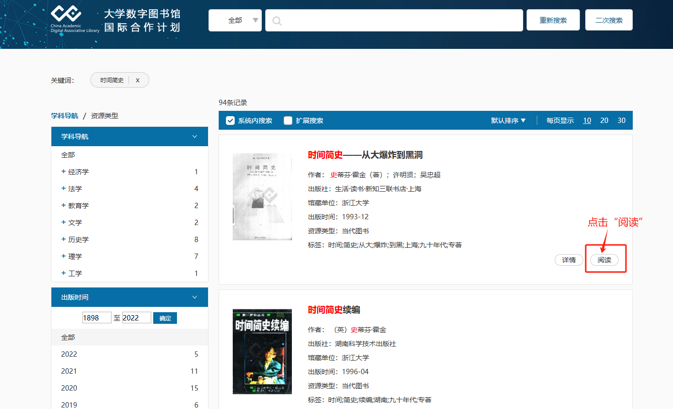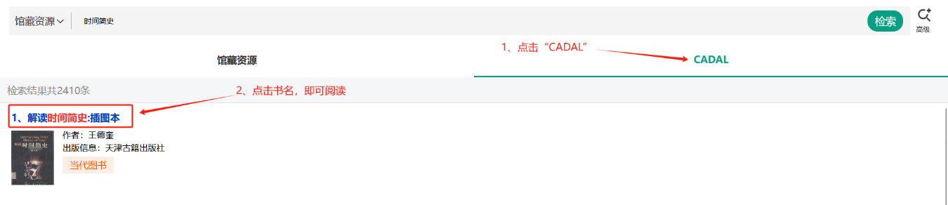 2、在检索框内输入所查找的书目(以时间简史为例),点击检索可得馆藏资源和CADAL相关资源,点击CADAL”。选择自己想阅读的图书,点击书名即可阅读。