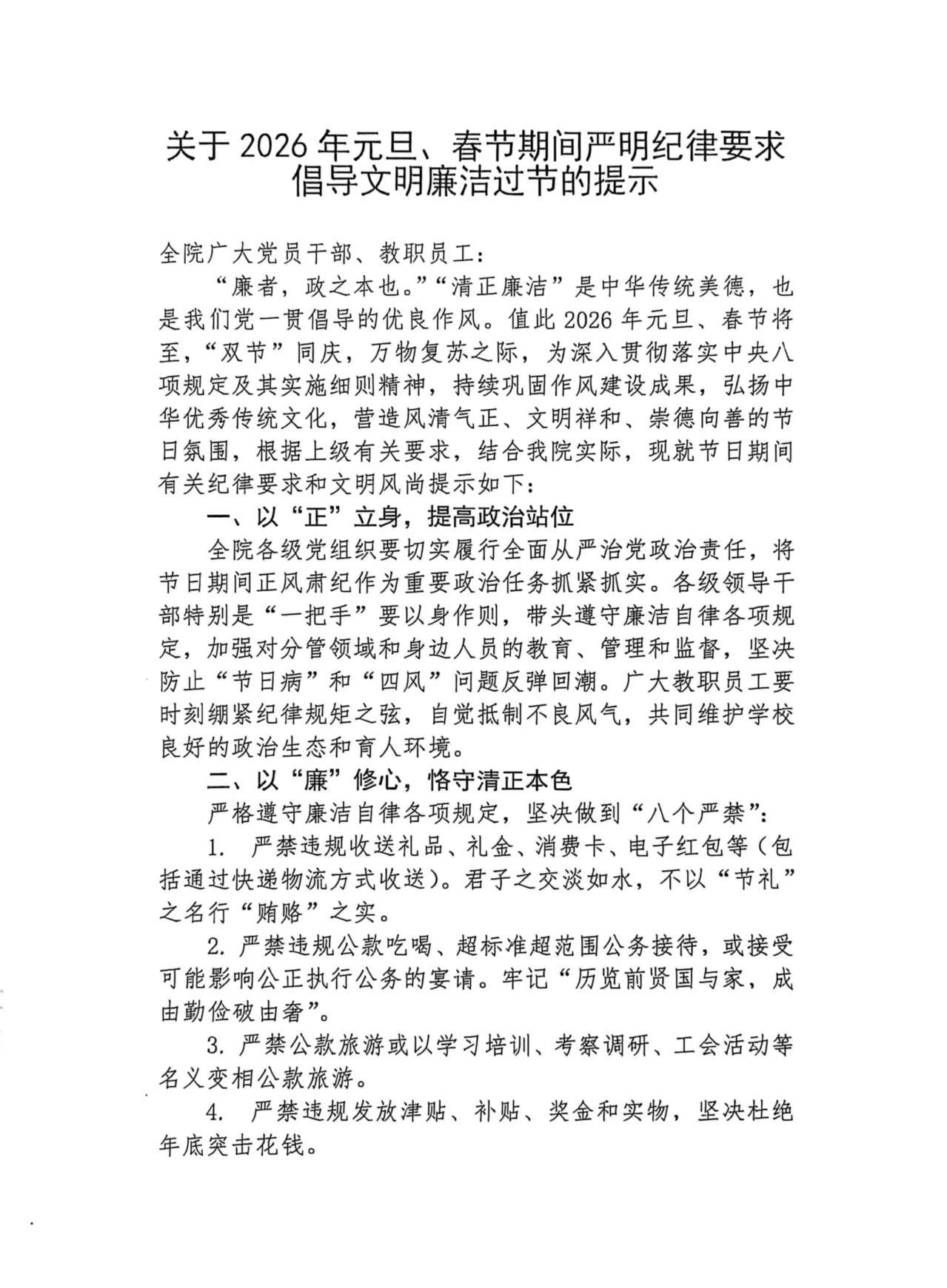 关于2026年元旦、春节期间严明纪律要求倡导文明廉洁过节的提示